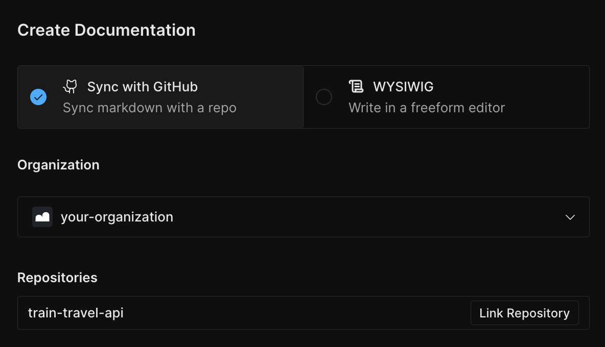 To use GitHub Sync go to the dashboard, click Create Documentation, then select GitHub Sync. Pick the appropriate organization from the dropdown and find the repository to link.