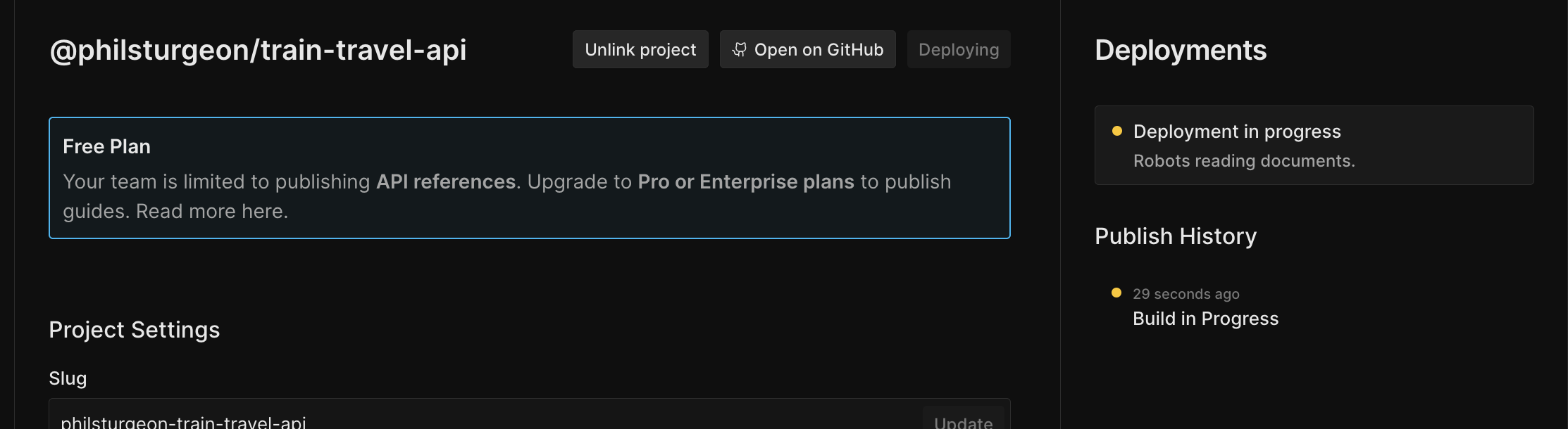 Let's switch these to Git Sync projects to keep the source of truth entirely under your control. To do this we can create a new repository to help track changes, or merge the downloaded OpenAPI/Markdown into the existing source code repository.